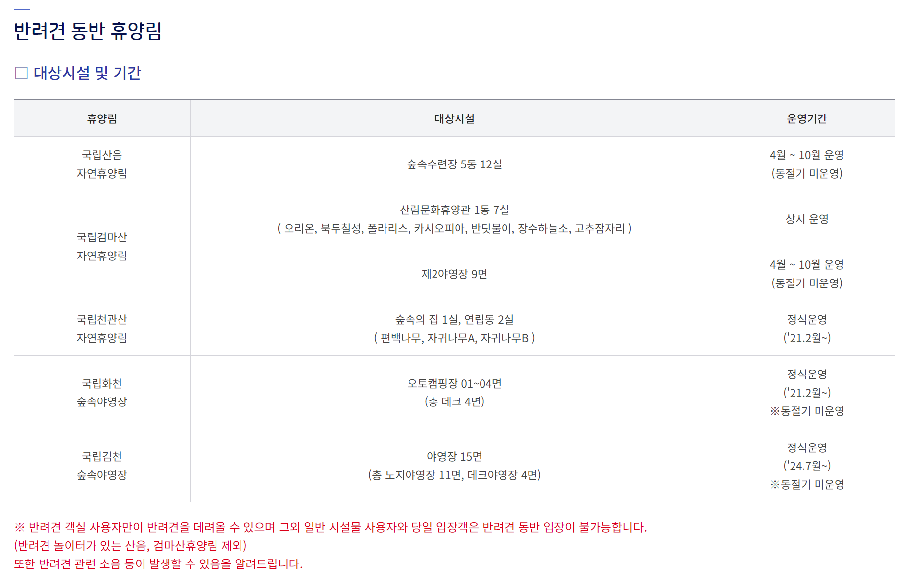 • 반려견 동반 시 추가 요금이 부과되는 경우가 많습니다. 비용은 자연휴양림마다 다르므로 미리 확인하고 예약하세요.
