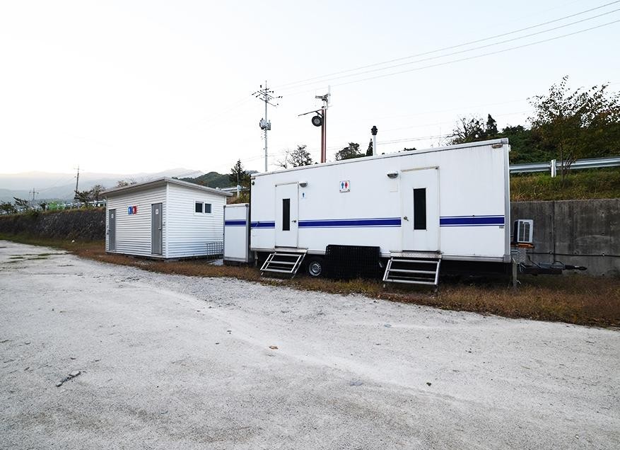 주차구역 중앙에는 화장실과 샤워장이 위치해 있습니다. 공용시설이지만 사용하는 내내 깨끗하게 유지되었고 평균적인 캠핑장 시설 대비 잘 관리되어 있다는 느낌을 받았습니다. 화장실 옆으로도 분리수거장이 있었고 캠핑장 이용하는 데 있어 크게 불편함이 없었습니다.