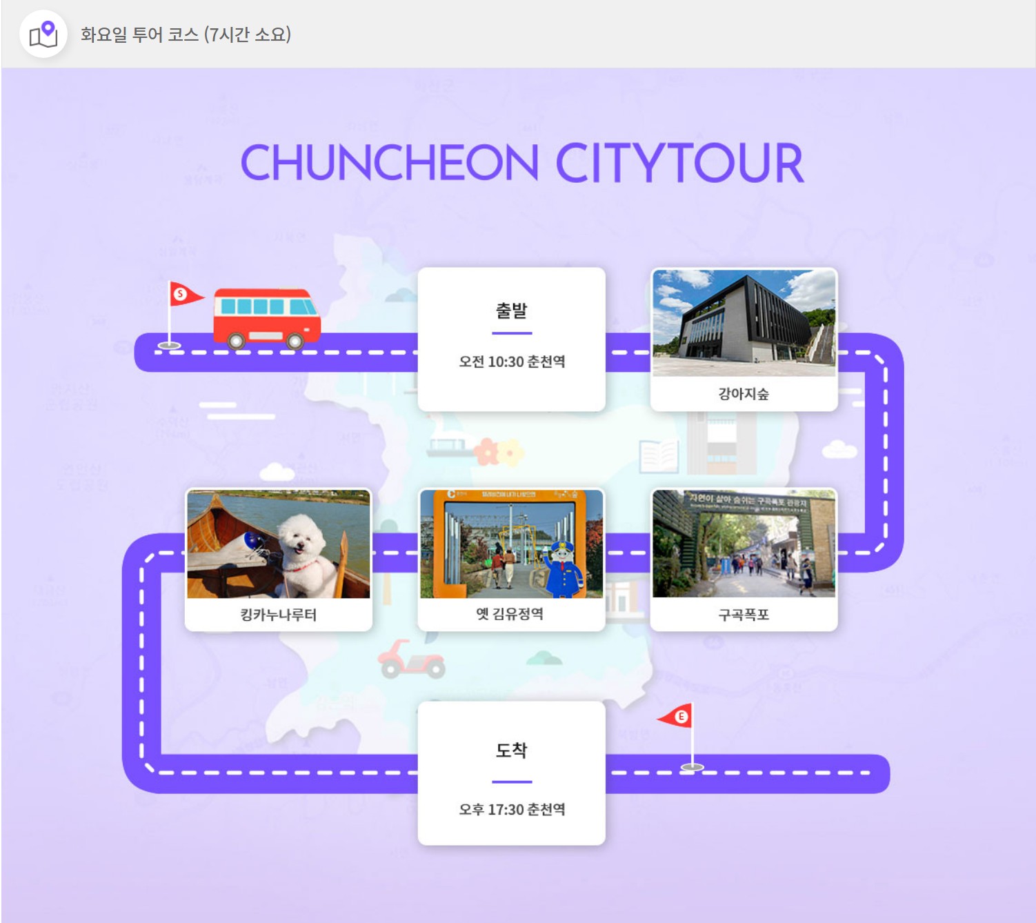 앞서 언급했듯이 춘천 시티투어버스는 매일 다른 코스로 시티투어를 운영하고 있습니다. 먼저 월요일부터 금요일까지의 코스를 소개해 드리려고 합니다. 공식 시티투어 사이트에도 직관적으로 잘 설명되어 있으니 홈페이지를 통해 자세한 내용을 확인하셔도 좋습니다.