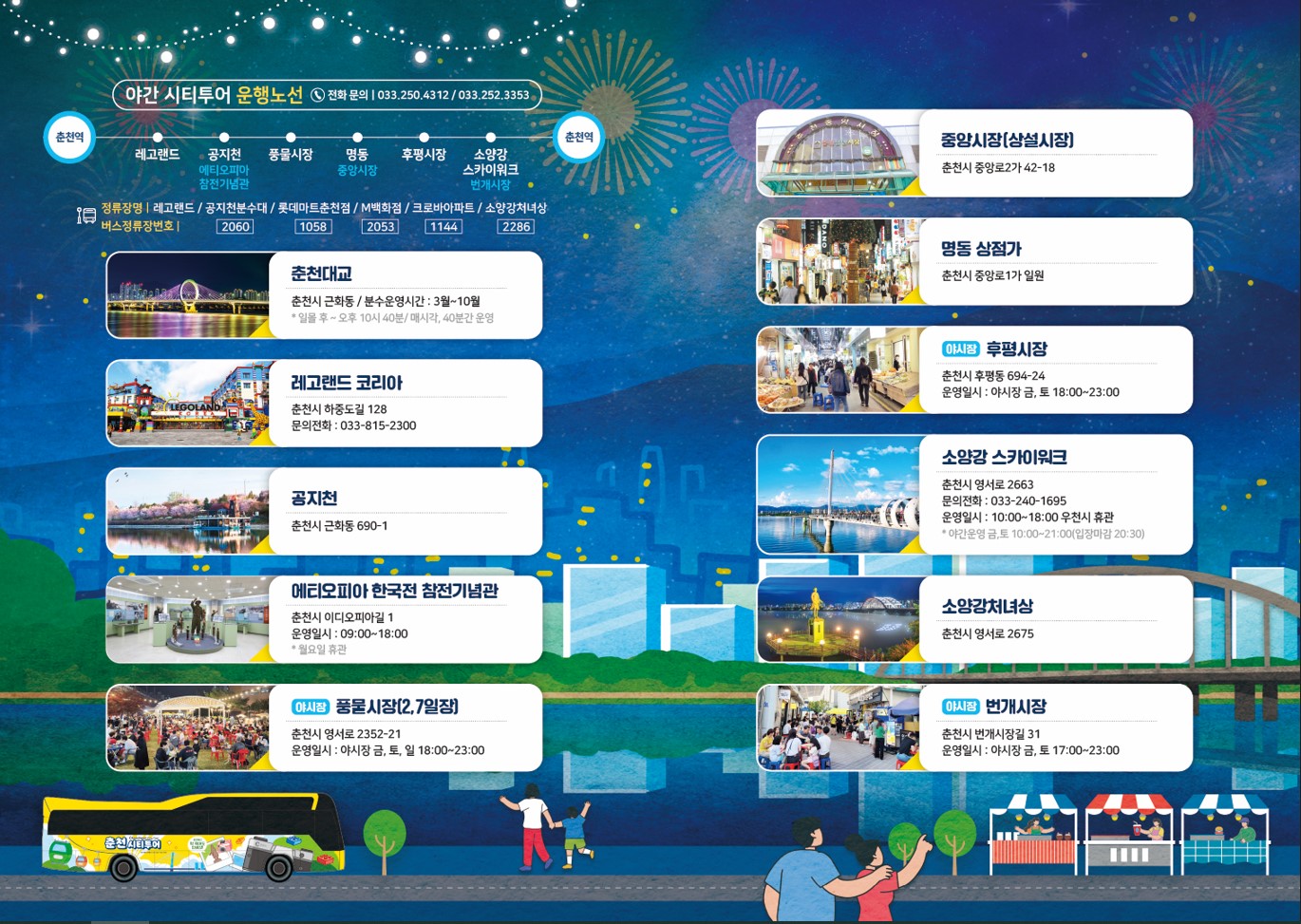 야간시티투어의 운행노선은 춘천역에서 출발하여 레고랜드 - 공지천 - 풍물시장 - 명동(중앙시장) - 후평시장 - 소양강 스카이워크를 끝으로 다시 춘천역에서 내리게 됩니다.